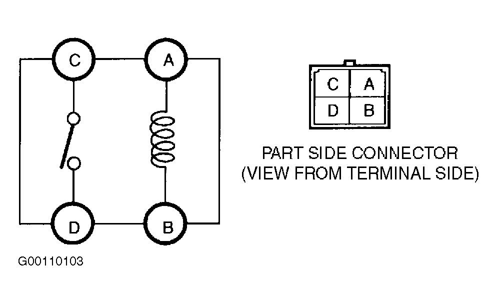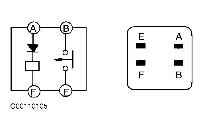 2. Using fused jumper wires, apply battery voltage to main relay terminal "A" and ground terminal "B" (terminal "F" on 626 or E" on MPV). Continuity should be present between main relay terminals "C" and "D" (terminals "B" and "E" on 626). See Fig 1 -Fig 3 . If continuity is not as specified, replace main relay.