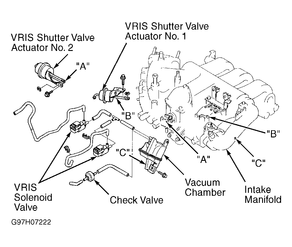 3. Start engine and run at idle. Using select SIMULATION TEST. Turn both VRIS solenoid valves on using VRISV1 or VRISV2 selection. Listen for clicking noise from VRIS solenoids. If both VRIS solenoids click, check VRIS shutter valve actuators. If VRIS solenoids do not click, check VRIS SOLENOID VALVE  .