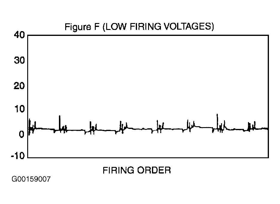 10. Check For Low Spark Plug Firing Voltage -  Check spark plug firing voltage average and evenness. Refer to Fig 6 . If there is consistently low spark plug firing voltage or sloping spark line on one or more cylinders, proceed as follows: