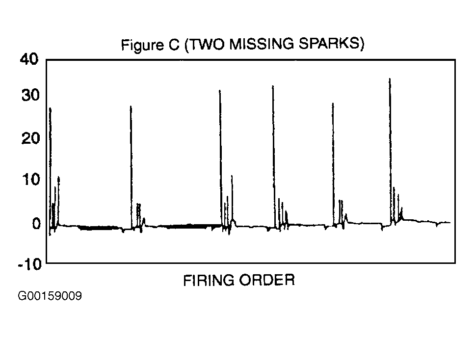 7. Check For Two Missing Spark Patterns On The Same Coil -  Observe scope pattern. Refer to Fig 3 . If spark pattern is missing from two cylinders on same coil, proceed as follows: