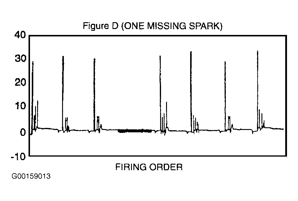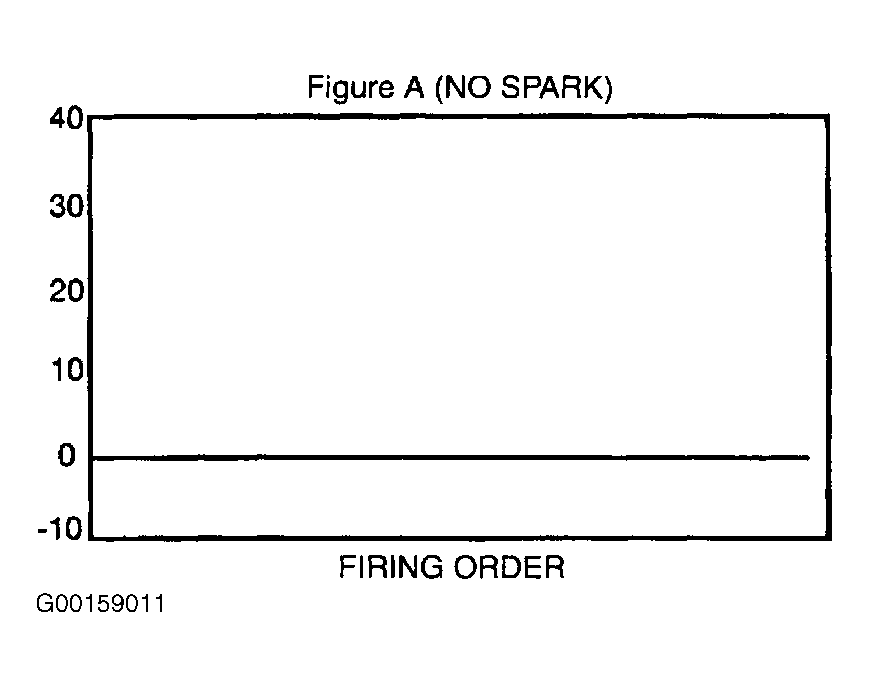 4. Check For Ignition Pattern -  Observe pattern on scope while cranking engine. Refer to Fig 1 . If pattern is flat, which indicates no spark on all cylinders, turn ignition off. Check condition of related fuses/fuse links. If okay, repair open circuit. If fuse/fuse link is damaged, check IGN START/RUN circuit for short to ground. Repair as necessary. Complete FUEL OR MISFIRE MONITOR REPAIR VERIFICATION DRIVE CYCLE  under MONITOR REPAIR VERIFICATION DRIVE CYCLES under DRIVE CYCLE PROCEDURES. If pattern is not flat, go to next step.