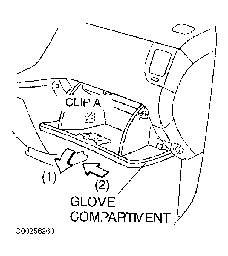 2. Pull the glove compartment toward you while pushing it downward (1), then remove clip "A". See Fig 3.