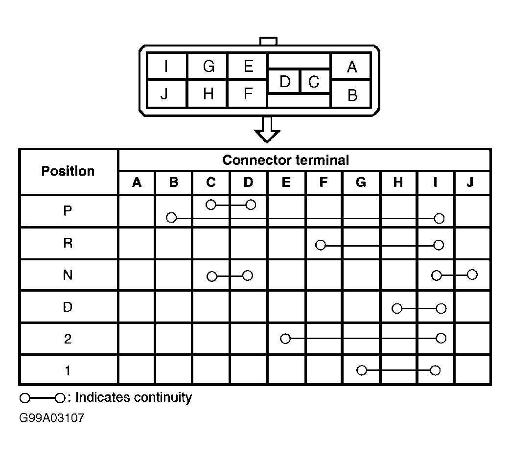 - To test switch, disconnect Transaxle/Transmission Range (TR) switch harness connector. Check for continuity between specified terminals at TR switch. See Fig 1, Fig 2, Fig 3, Fig 4, Fig 5 or Fig 6