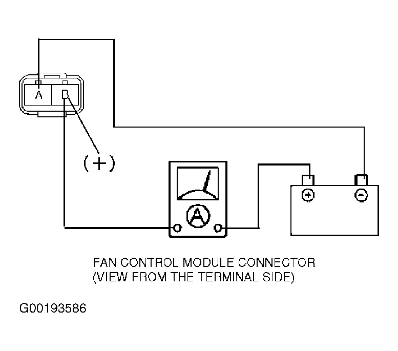- Ensure battery is fully charged. Disconnect cooling fan 2-pin harness connector from fan control module. Connect ammeter between positive battery terminal and positive terminal of fan control module 2-pin harness connector (cooling fan harness). Ground negative terminal of fan control module 2-pin harness connector (cooling fan harness). See Fig 1.