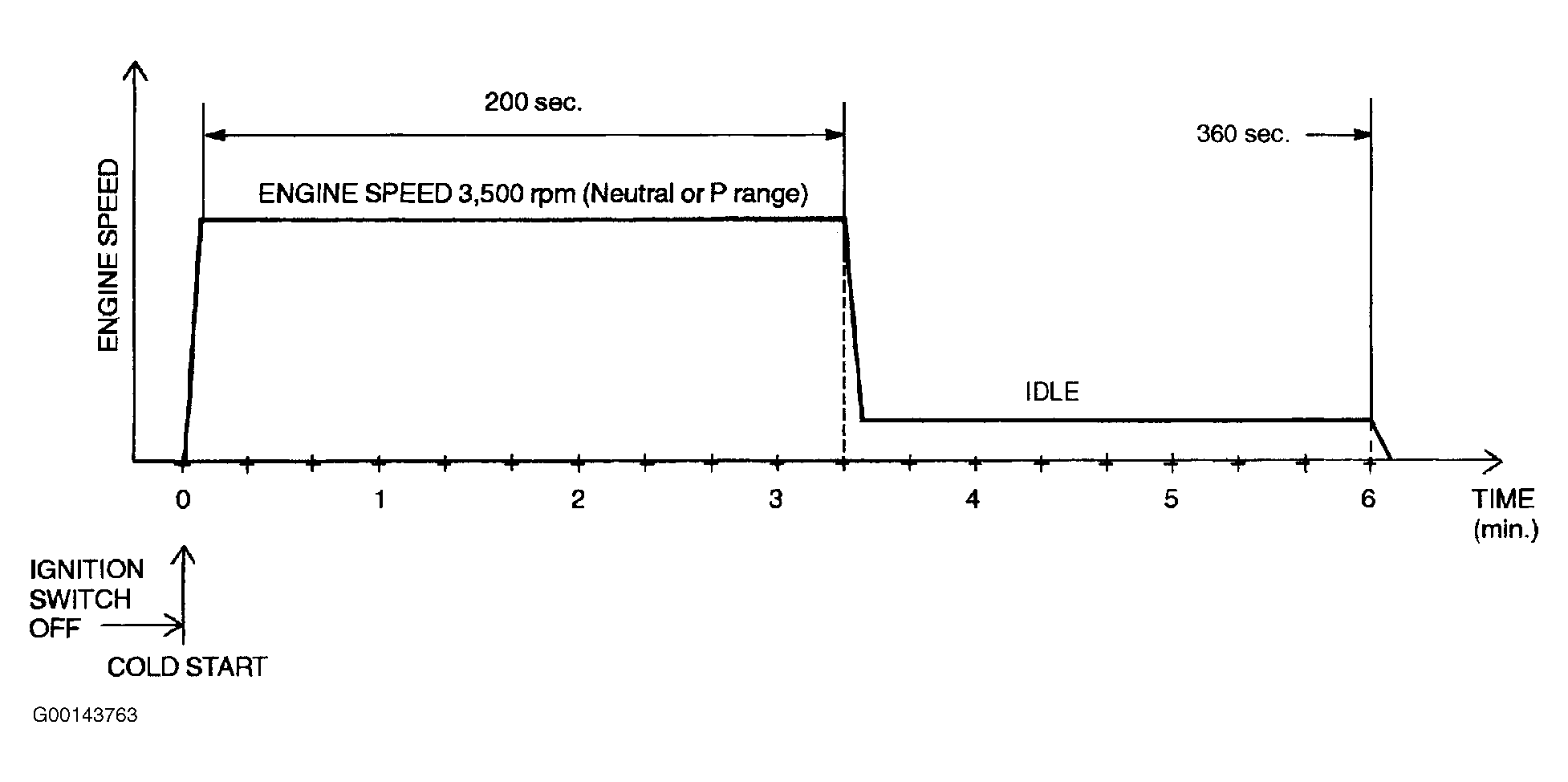 2. Ensure all accessory loads (A/C, headlights, blower fan, rear window defroster) are off. Start engine and race at 3500 RPM for 200 seconds to warm up to normal operating temperature, then let idle for 120 seconds. See Fig 2.