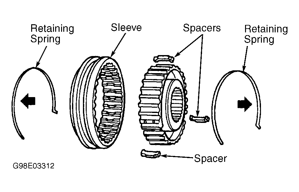 Mark parts for reassembly reference. Remove one retaining spring, flip synchronizer over and remove opposite spring. Remove 3 insert spacers and remove synchronizer sleeve. See Fig 1. Inspect for any wear or damage. To reassemble, reverse disassembly procedure.