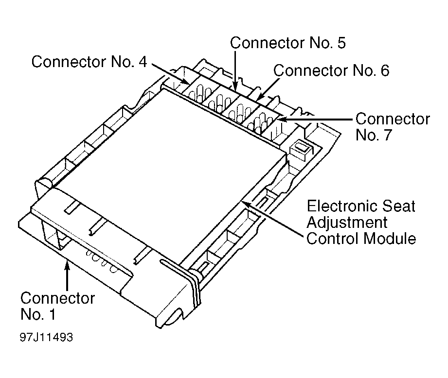 - Turn ignition switch to LOCK position. Disconnect Electronic Seat Adjustment (ESA) control module harness connector No. 1. See Fig 1. Measure resistance between terminals No. 8 and 12 at ESA control module harness connector No. 1. When steering column adjustment switch is in rest position, approximately 470 ohms should exist. When steering column adjustment switch is pressed to FORWARD position, approximately 39 ohms should exist. When steering column adjustment switch is pressed to REARWARD position, approximately 16 ohms should exist. If resistance is as specified, go to next step. If resistance is not as specified, check the following as possible cause and repair as necessary: