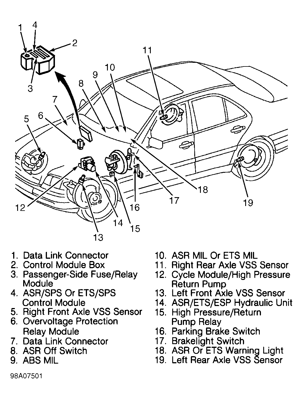 Fig 2: Identifying & Locating ABS/ASR V Components With ETS (C230, C280 As Of 6-97 & CLK320)