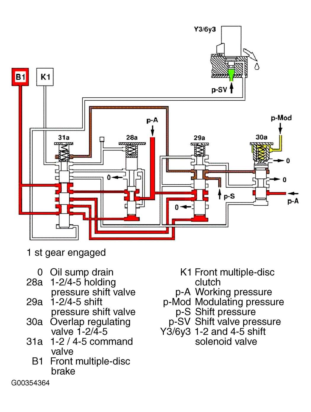 The end face of the 1-2/4-5 command valve (31a) is kept depressurized via the 1-2 and 4-5 shift solenoid valve (Y3/6y3). Via the 1-2/4-5 holding pressure shift valve (28a), working pressure (p-A) is applied to the front mutiple-disc clutch (K1) is depressurized.