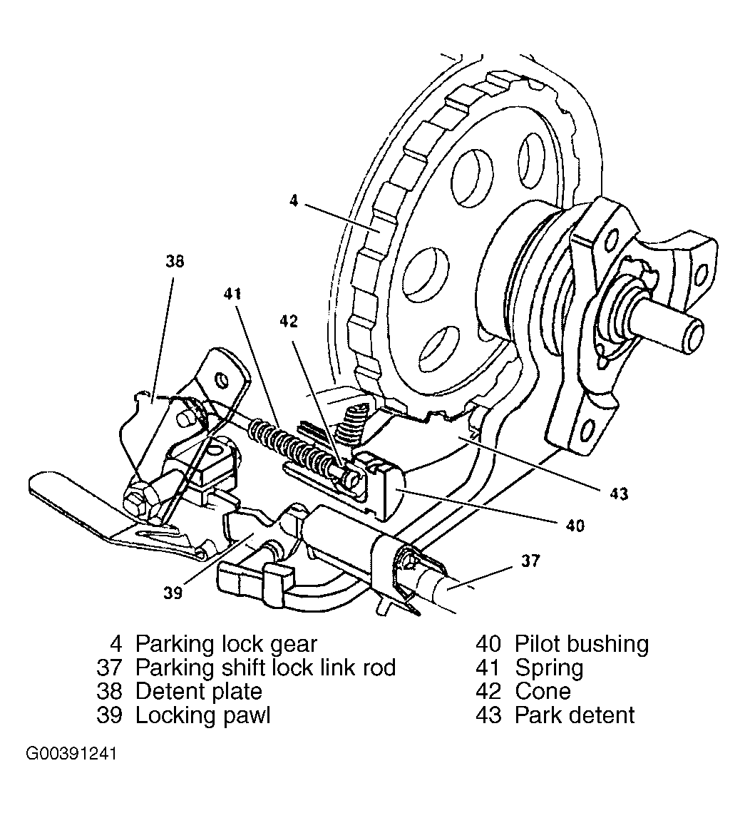 To prevent damage due to misuse, the intervals between the tooth gaps are such that the park detent (43) can only engage when the vehicle is stationary or crawling at low speed. If the vehicle rolls faster, the shape of the teeth prevents the parking lock pawl (43) from engaging.