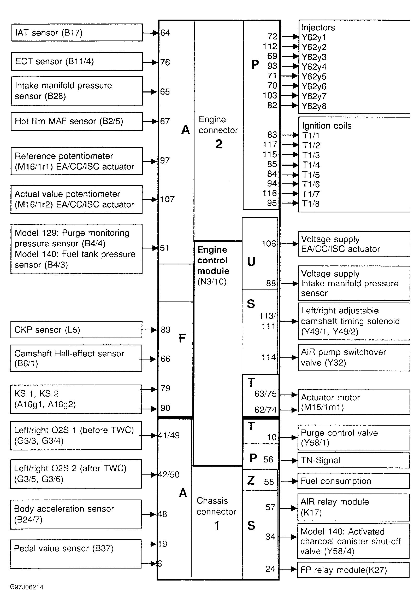 The Motor Electronics Sequential Fuel Injection (ME-SFI) system consists of activated charcoal canister shut-off valve, adjustable camshaft timing solenoid, AIR pump, AIR pump switchover valve, Base Module (BM), body acceleration sensor, camshaft hall-effect sensor, Crankshaft Position (CKP) sensor, Electronic Accelerator/Cruise Control/Idle Speed Control (EA/CC/ISC) actuator, Engine Control Module (ECM), Engine Coolant Temperature (ECT) sensor, fuel injectors, fuel tank pressure sensor, hot film mass airflow sensor, Intake Air Temperature (IAT) sensor, ignition coils, intake manifold pressure sensor, Knock Sensor (left and right side), oil level switch, Oxygen Sensor (O2S) (downstream), Oxygen Sensor (O2S) (upstream), pedal value sensor, purge control valve, purge monitoring pressure sensor, and Transmission Control Module (TCM). See Fig 1 -Fig 2 .