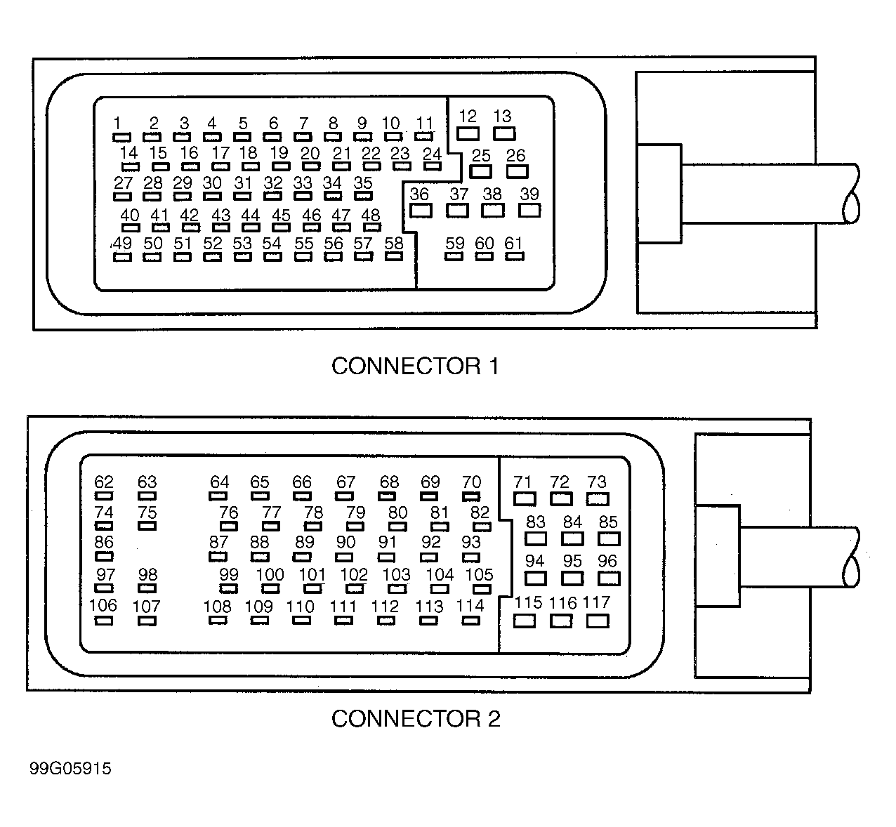 Vehicle is equipped with 2 ME-SFI control modules, right cylinder bank ME-SFI control module (N3/12) and left cylinder bank ME-SFI control module (N3/11). Each ME-SFI control module has 2 connectors, No. 1 and No. 2. Connector No. 1 has terminals No. 1-61 and connector No. 2 has terminals No. 62-117. Both ME-SFI control modules are located next to each other in right rear corner of engine compartment. Right cylinder bank ME-SFI control module (N3/12) is located nearest to passenger fender. Left cylinder bank ME-SFI control module (N3/11) is located farthest from passenger fender. For ME-SFI connector identification, see Fig 1 .