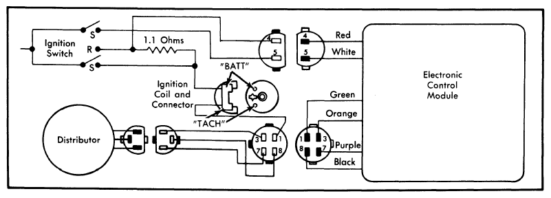 Each Dura-Spark II module has 6 wires (a 2-wire and a 4-wire connector). See Figureand Figure. Modules with dual mode timing have an additional 3-wires leading to one 3-wire connector. The Red and White wires are the ignition feed wires (the White wire is for cranking and Red wire is for operation after the engine is running). The Red wire circuit contains a 1.1 ohm resistance wire. The current to the primary circuit of the ignition coil is turned off and on through the Green wire. The Orange and Purple wires transmit signals to the electronic control module from the reluctor (armature) and pick-up coil (stator) in the distributor. The Black wire is used to ground the electronic control module through the distributor housing. On models with dual mode timing, the additional 3 wires connect to either a vacuum modulator valve or a barometric pressure switch.