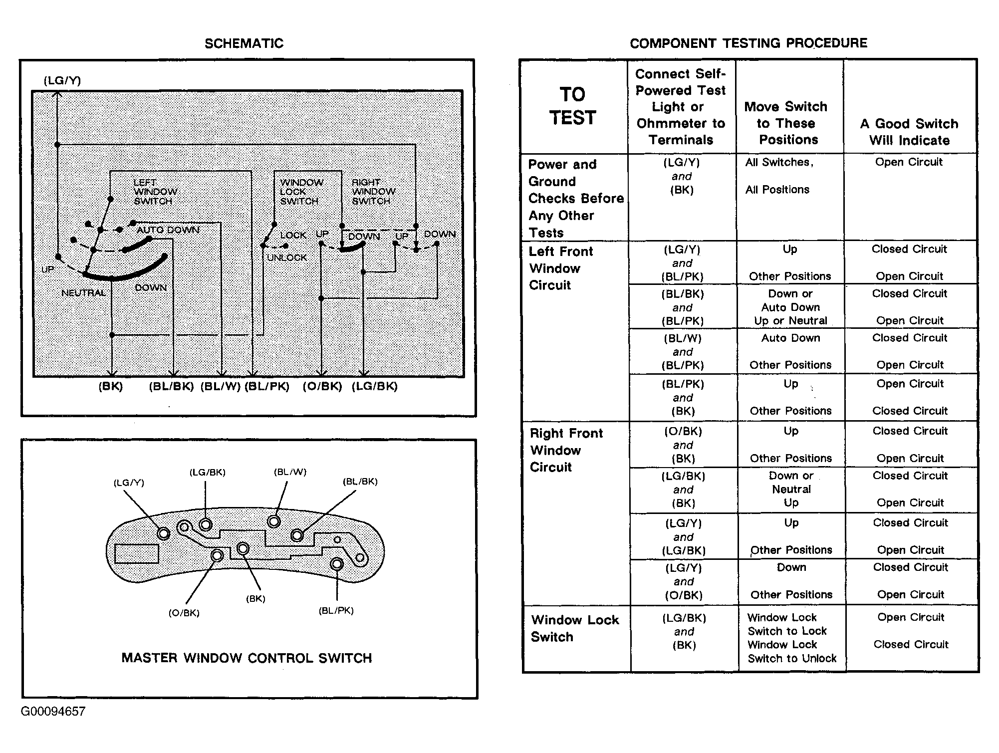 Remove power window main switch and disconnect connector. See POWER WINDOW SWITCH under REMOVAL & INSTALLATION. Using a test lamp or ohmmeter, test the power window switch at specified terminals for specified switch positions. Replace switch if operation is not as specified. See Fig 1 .