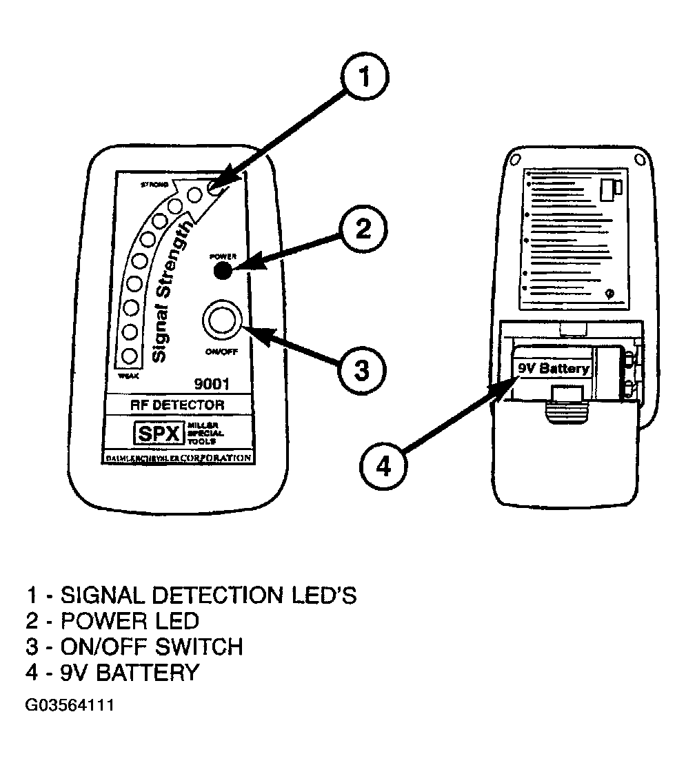 If the Universal Transmitter is inoperative, but the Electronic Vehicle Information Center (EVIC) is operating normally, see the owner's manual in the vehicle glove box for instructions on training the Transmitter. Retrain the Transmitter with a known good transmitter as instructed in the owner's manual and test the Transmitter operation again. If the unit is still inoperative, test the universal transmitter with Radio Frequency Detector special tool. If both the Transmitter and the EVIC module are inoperative, refer to ELECTRONIC VEHICLE INFORMATION CENTER DIAGNOSIS AND TESTING for further diagnosis. For complete circuit diagrams, refer to appropriate SYSTEM WIRING DIAGRAMS article. (Fig 1 ) as described below: