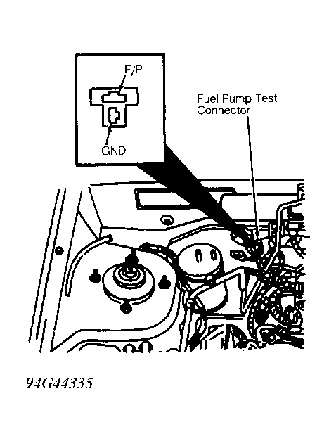 - Turn ignition on. Connect jumper wire between fuel pump test connector terminal and ground. Fuel pump test connector is located at right rear of engine compartment. See Figure . Turn on ignition to activate fuel pump.