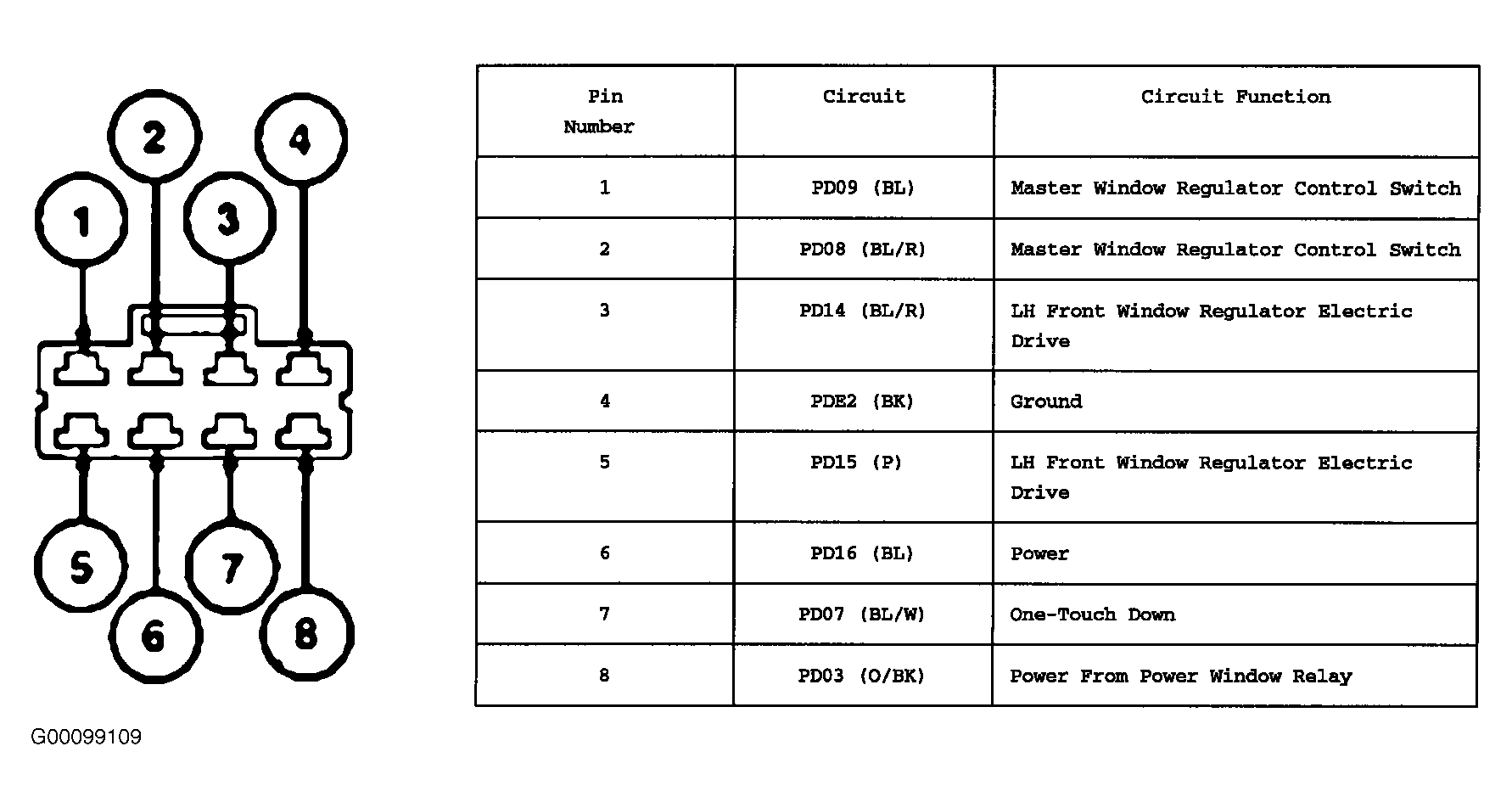 - Turn the ignition switch to OFF position. Disconnect the master window regulator control switch connector and the power window module connector. Measure the resistance of the Blue wire between the master window regulator control switch connector and terminal No. 1 of the power window module connector. Measure the resistance of the Blue wire between the master window regulator control switch connector and ground. See Figure. See WIRING DIAGRAMS . Is the resistance less than 5 ohms between the master window regulator control switch and the power window module, and greater than 10,000 ohms between the master window regulator control switch and ground? If yes, then replace the power window module. See POWER WINDOW MODULE under REMOVAL & INSTALLATION. If not, then repair the Blue wire.