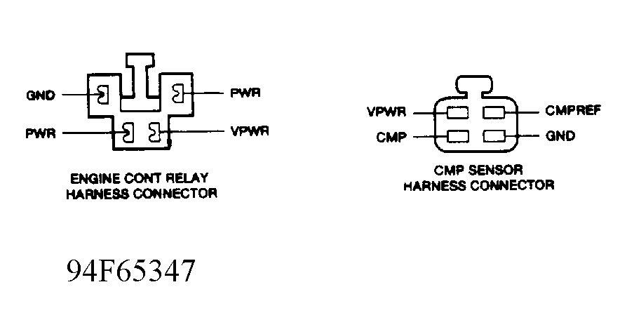 4) Check Continuity Between CMP & Engine Continuity Relay Turn ignition off. Disconnect CMP sensor. Disconnect engine continuity relay wiring harness connector, located in left engine compartment fuse panel. Check for continuity between VPWR terminal of relay connector and VPWR terminal of CMP sensor connector. See Fig 1 . If continuity is not present, repair VPWR circuit. If continuity is present, go to CIRCUIT TEST VPWR.