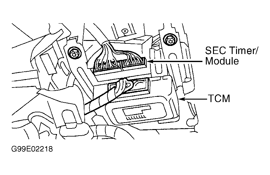 Disconnect negative battery cable. Remove Transmission Control Module (TCM) from bracket and position to side. Remove TCM bracket. See Fig 1 . Remove Smart Entry Control (SEC) timer/module wiring harness connector. Remove 3 mounting screws. Remove SEC timer/module. To install, reverse removal procedure.
