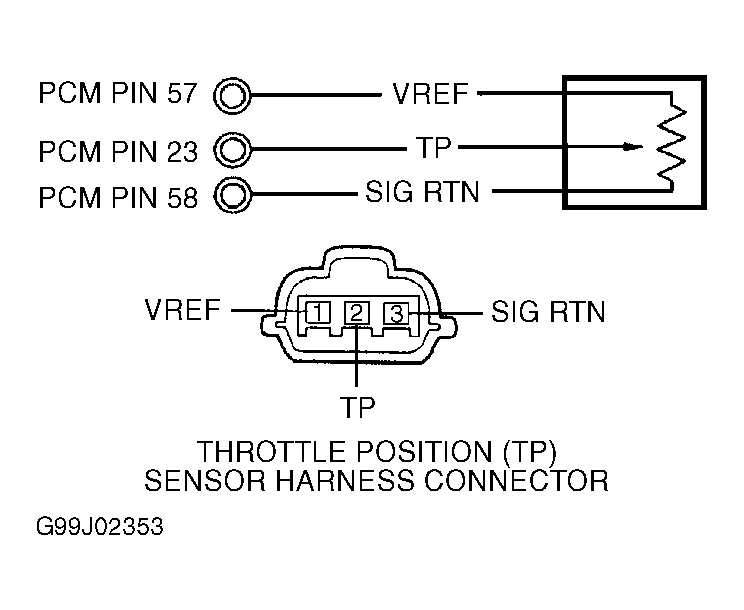 Turn ignition off. Connect scan tool to Data Link Connector (DLC). Turn ignition on. Using scan tool, access TP PID from PID/DATA MONITOR & RECORD menu. If TP PID is .35-4.60 volts, leave scan tool connected and go to step 30). If TP PID is less than .35 volt, go to step 10). If voltage is more than 4.60 volts, leave scan tool connected and go to step 20).NOTE: A break in step numbering sequence occurs at this point. Procedure skips from step 2) to step 10). No test procedures have been omitted. - 10) Check VREF Circuit Voltage To TP Sensor