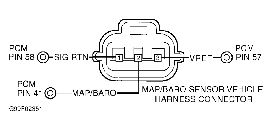 Turn ignition off. Disconnect MAP/BARO sensor harness connector. Disconnect PCM harness connector. Inspect connector for damaged pins and repair if necessary. Using DVOM, measure resistance of MAP/BARO circuit between MAP/BARO sensor connector and PCM harness connector terminal No. 41 (Pink wire). See Figure and Figure . If resistance is less than 5 ohms, go to next step. If resistance is 5 ohms or more, repair open in circuit. See WIRING DIAGRAMS article. - 4) Check MAP/BARO Sensor Circuit For Short To Ground