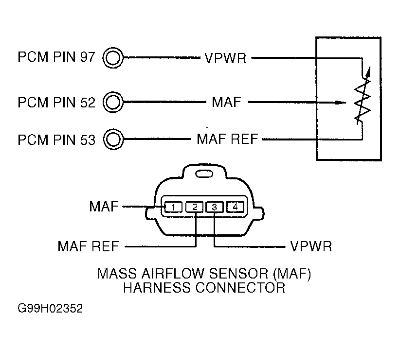 Turn ignition off. Disconnect PCM and MAF sensor harness connectors. Using DVOM, measure resistance between MAF, MAF REF and VPWR circuits at PCM harness connector. See Figure and Figure . If resistances are more than 10 k/ohms, replace MAF sensor. If any resistance is 10 k/ohms or less, repair short between affected circuits. See WIRING DIAGRAMS article.NOTE: A break in step numbering sequence occurs at this point. Procedure skips from step 20) to step 30). No test procedures have been omitted. - 30) MAF Sensor Performance Check