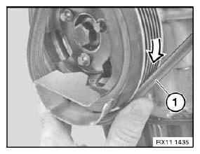 Place ribbed V-belt (1) in direction of arrow on vibration damper.