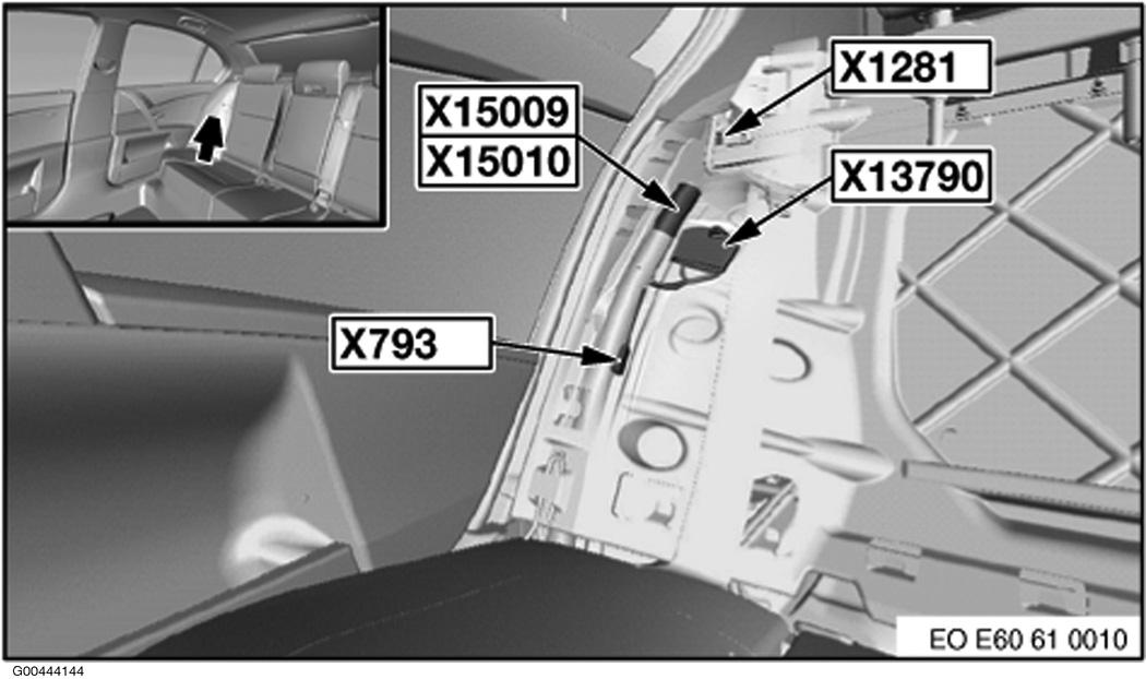 | X15010 | Behind right side of right rear seat. See Figure. |