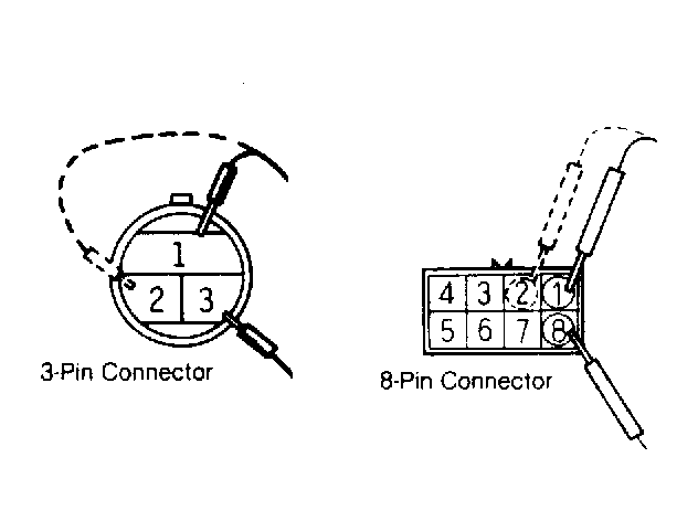 - Disconnect carburetor connector. Measure resistance between terminals No. 1 (power) and No. 8 (ground) on Montero and Pickup. Measure resistance between terminals No. 1 and No. 3 on all other models. See Fig 1. Standard resistance is 3500-6500 ohms.