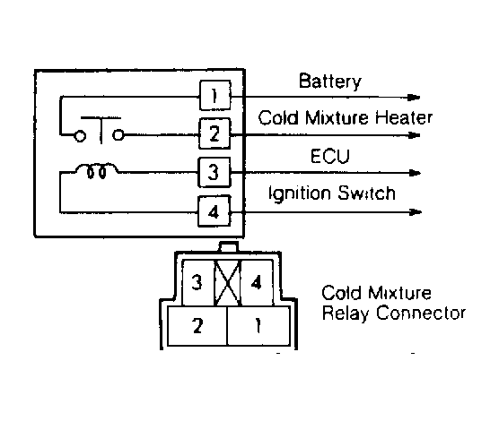 Remove cold mixture heater relay. With battery voltage applied to terminals No. 3 and 4, there should be no continuity between terminals No. 1 and 2. With no battery voltage applied, terminals No. 1 and 2 should have continuity. See Figure.