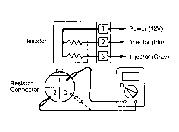 - Disconnect electrical connector from resistor. Connect Harness (MD998459 ) to resistor side of disconnected connector. Measure resistance across terminals No. 1 and 2, then 1 and 3. See Fig 1. If resistance is between 5.5 and 6.5 ohms, resistor is good.