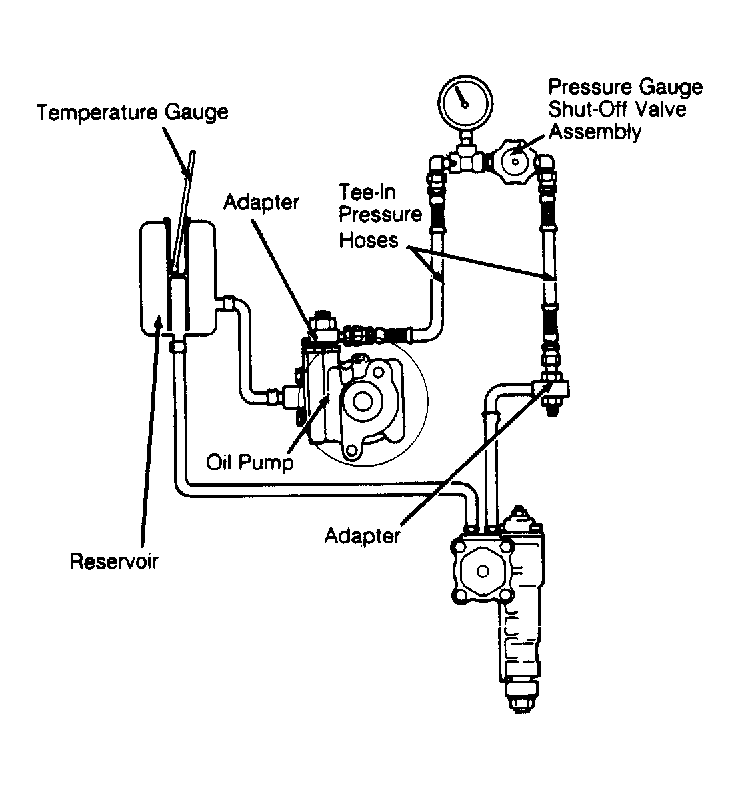 1. Disconnect pressure hose from power steering pump. Connect in-line a pressure gauge and hoses capable of handling 300 psi (21 kg/cm2 ). Also, connect a shut-off valve in-line with the pressure gauge. See Fig 1 .