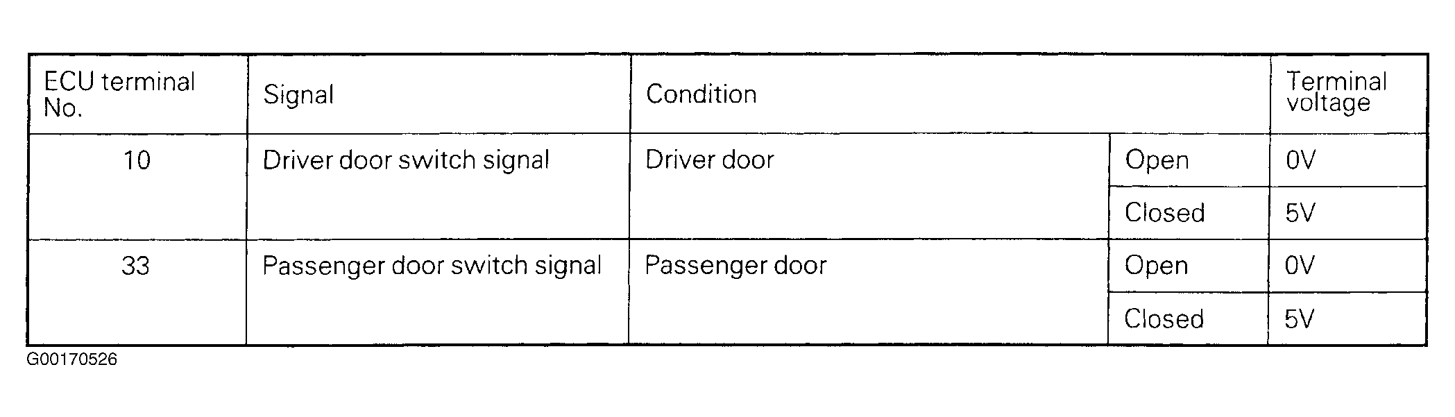 When the front door is closed (the door switch is switched OFF), HIGH-level signals are sent to the electronic control unit; when the front door is opened (the door switch is switched ON), LOW-level signals are sent to the electronic control unit. See Fig 1