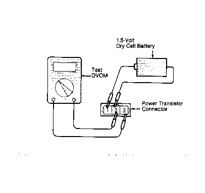 - Disconnect power transistor connector. Using a 1.5-volt dry cell battery, connect negative end of 1.5-volt battery to terminal No. 2 of power transistor and positive end of 1.5-volt battery to power transistor terminal No. 1. See Fig 1