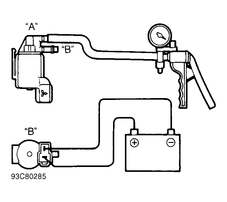4. Remove vacuum hoses from solenoid. Ensure solenoid harness connector is disconnected. Connect a vacuum pump to solenoid nipple "A". Use jumper wires to connect battery voltage to solenoid terminals. See Fig 1 . With vacuum applied, nipple "B" unplugged, and negative jumper wire disconnected, solenoid should hold vacuum.