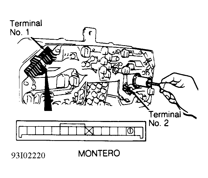 Application Terminal No. Montero 13 Pickup & Ram-50 10 - With VSS connector and ECM connector disconnected, turn ignition switch to ON position. Using DVOM, check for voltage between chassis ground and specified VSS connector terminal. See VSS VOLTAGE FEED CIRCUIT ID