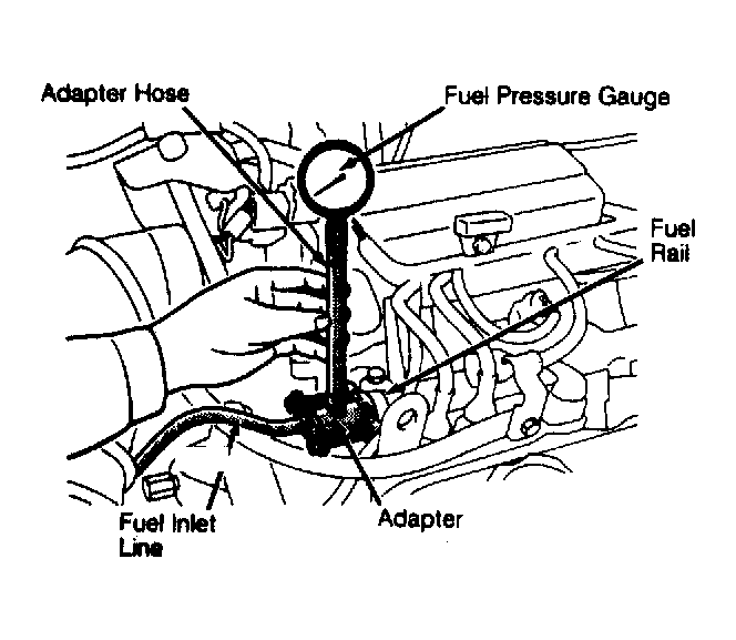 - Disconnect high pressure fuel hose at fuel delivery pipe. Remove throttle body bracket (if necessary). Connect fuel pressure gauge with adapter between fuel delivery pipe and high pressure hose. See Fig 1 .