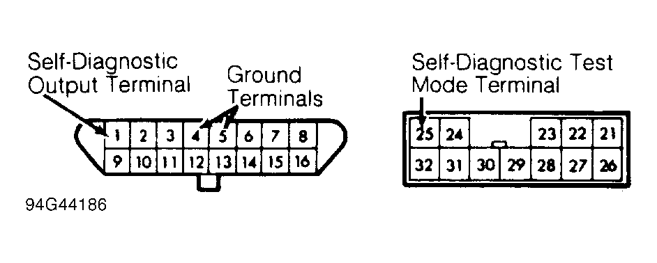 1. Before entering on-board diagnostics, see SERVICE PRECAUTIONS  . Turn ignition switch to OFF position. Locate Data Link Connector (DLC), next to fuse block. Connect volt-meter positive lead to DLC self-diagnostic test mode terminal and negative lead to either DLC ground terminal. See Figure .