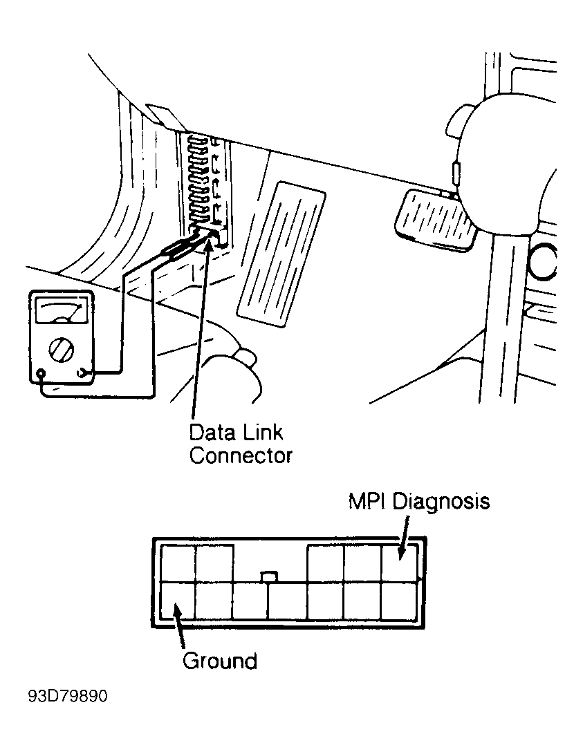 1. Before entering on-board diagnostics, refer to SERVICE PRECAUTIONS  . Turn ignition switch to OFF position. Locate Data Link Connector (DLC), next to fuse block. Connect voltmeter positive lead to Data Link Connector (DLC) MFI diagnosis terminal and negative lead to ground terminal. See Fig 1 .