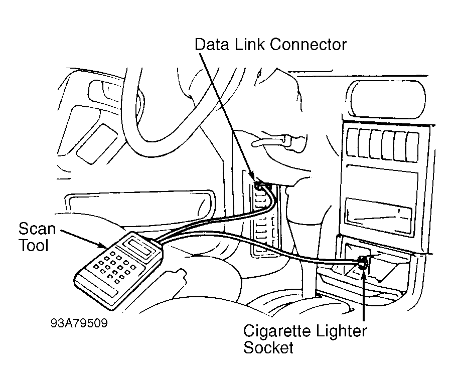 1. Before entering on-board diagnostics, refer to SERVICE PRECAUTIONS  . Turn ignition switch to OFF position. Locate Data Link Connector (DLC), next to fuse block. Connect power source terminal of scan tester to cigarette lighter socket. See Fig 1 .
