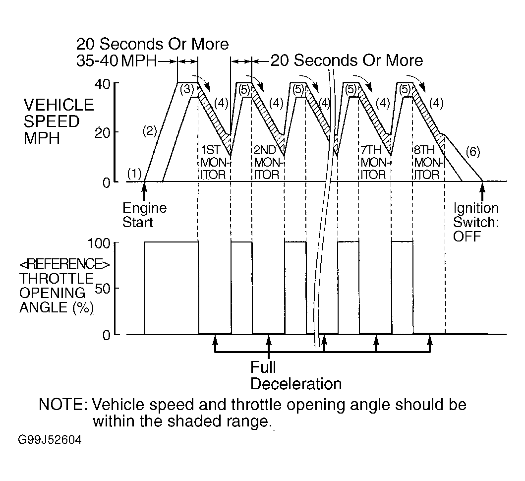 6. Accelerate to 35-40 MPH, then hold speed constant for 20 seconds or more (M/T: 4th gear). Repeat steps 4)  and 5)  seven more times.