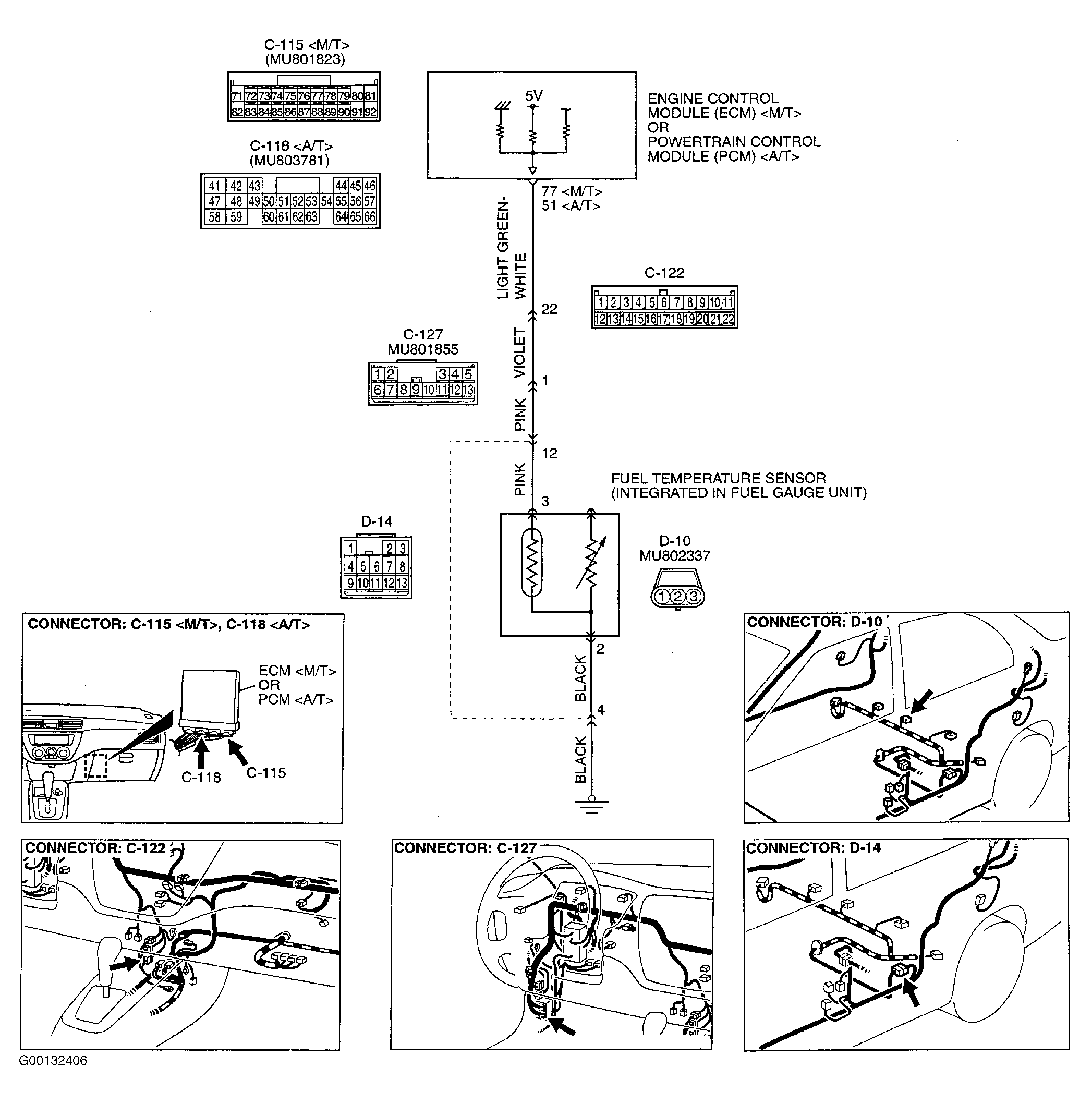 A 5-volt voltage is applied to fuel temperature sensor output terminal (terminal No. 3) from ECM (terminal No. 77 - M/T) or PCM (terminal No. 51 - A/T) via the resistor in the ECM (M/T) or PCM (A/T). The fuel temperature sensor output voltage increases when resistance increases and decreases when resistance decreases. The ground terminal (terminal No. 2) is grounded to vehicle body. See Figure and Figure .