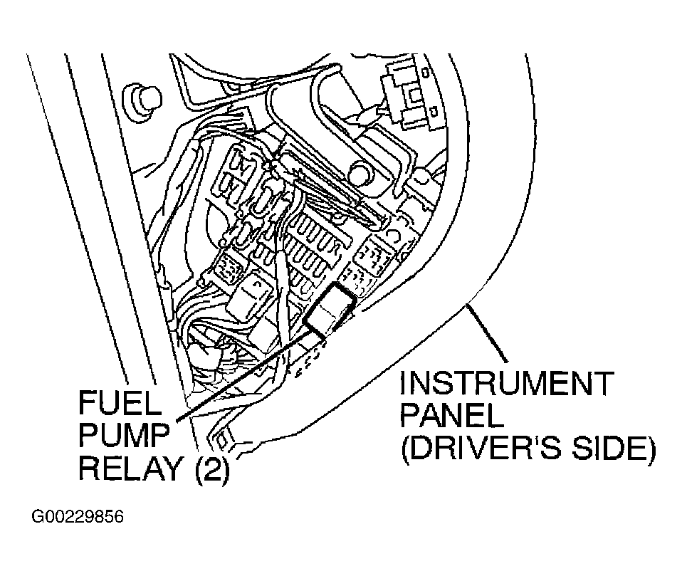 Remove the instrument panel side cover (driver's side). Disconnect the fuel pump relay (2). See Fig 1. Start the engine and let it run until it stops naturally. Turn the ignition off. Connect the fuel pump relay (2). Install the instrument panel side cover (driver's side).