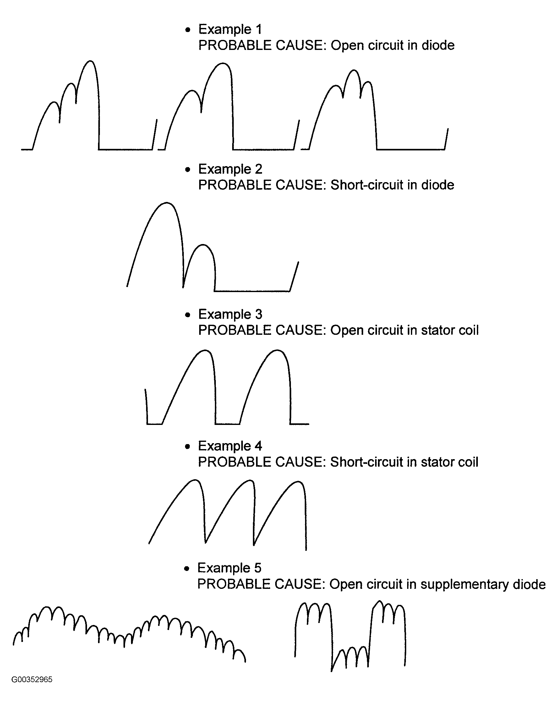 Identification of abnormal waveforms is easier when there is a large output current (regulator is not operating). Waveforms can be observed when the headlights are illuminated.