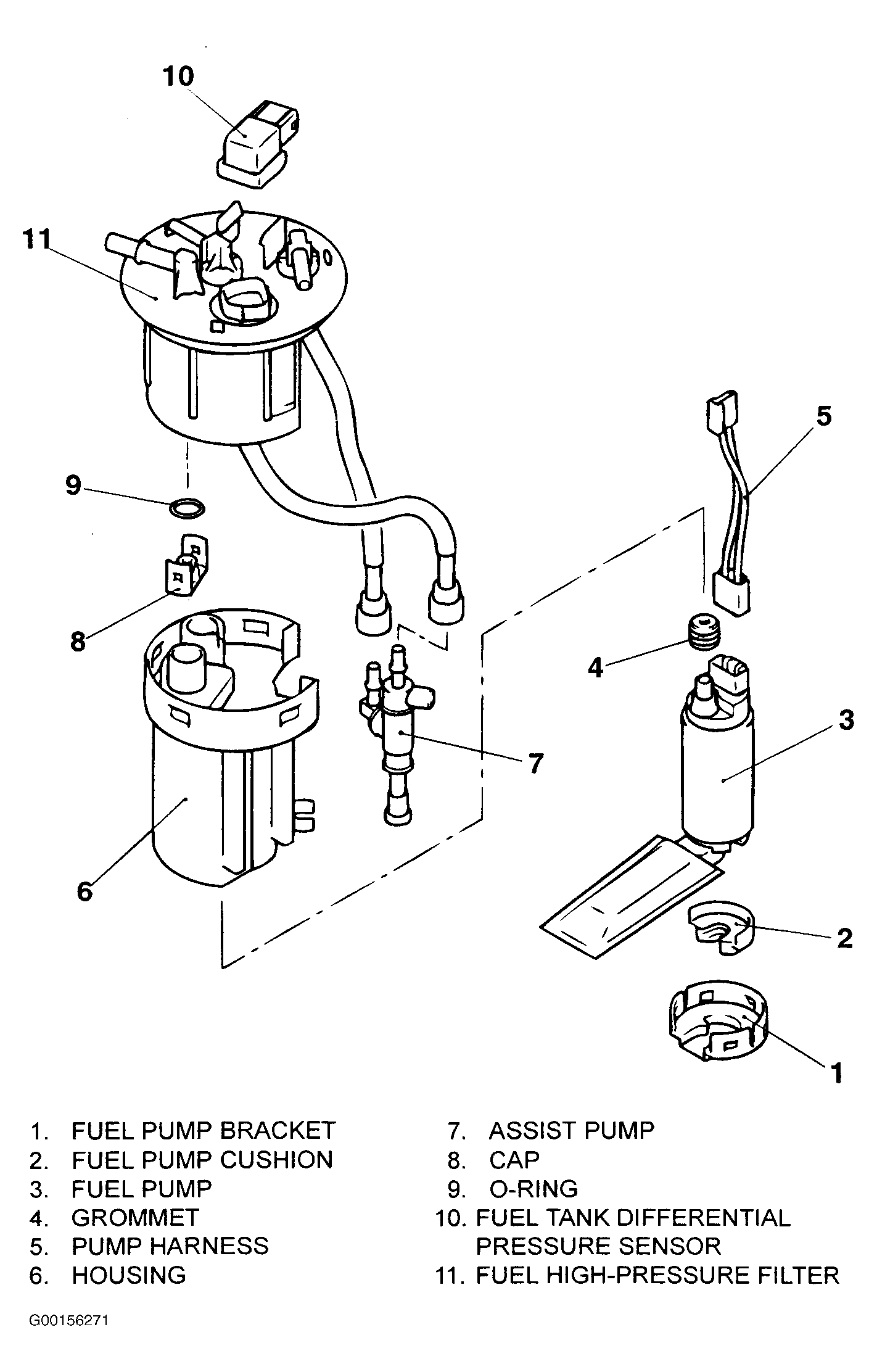 - Remove fuel pump bracket. See Fig 1. Remove fuel pump cushion and fuel pump. Remove grommet and pump harness. Remove housing. Remove assist pump. Remove cap and "O" ring. Remove fuel tank differential pressure sensor and high pressure fuel filter.