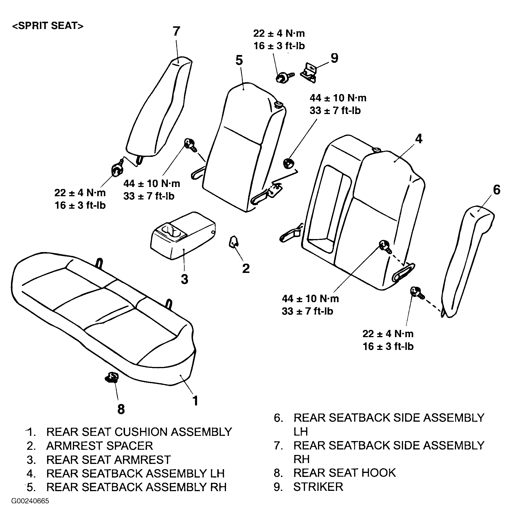 2. Remove rear seat cushion assembly. See Figure. Remove armrest spacer and rear seat armrest. Remove left and right rear seatback assembly. Remove right and left rear seatback side assembly. Go to next step.