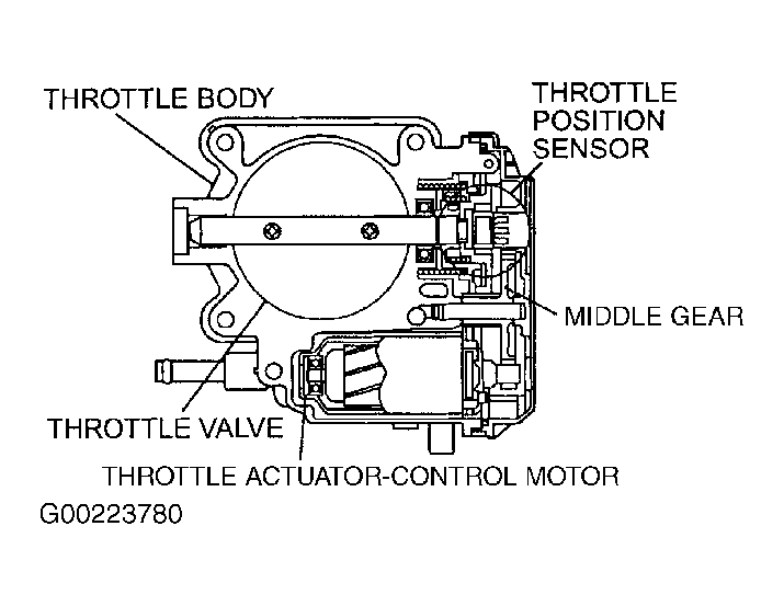 The Throttle Position (TP) sensor, which is located in throttle body, outputs a voltage signal, which corresponds to rotational angle of throttle shaft, to Powertrain Control Module (PCM). See Fig 1. In accordance with this signal, PCM effects feedback control of throttle actuator control motor. This TP sensor uses a non-contact Hall IC to enhance its reliability.