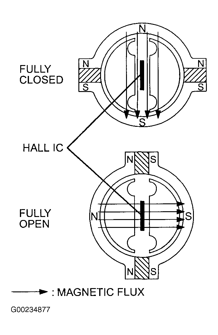 The magnetic flux density that passes into Hall IC when throttle valve is fully closed is kept to a minimum, resulting in minimal electrical voltage output. See Fig 3. Magnetic flux density that passes into Hall IC when throttle valve is fully open is kept to a maximum, resulting in maximal electrical voltage output.