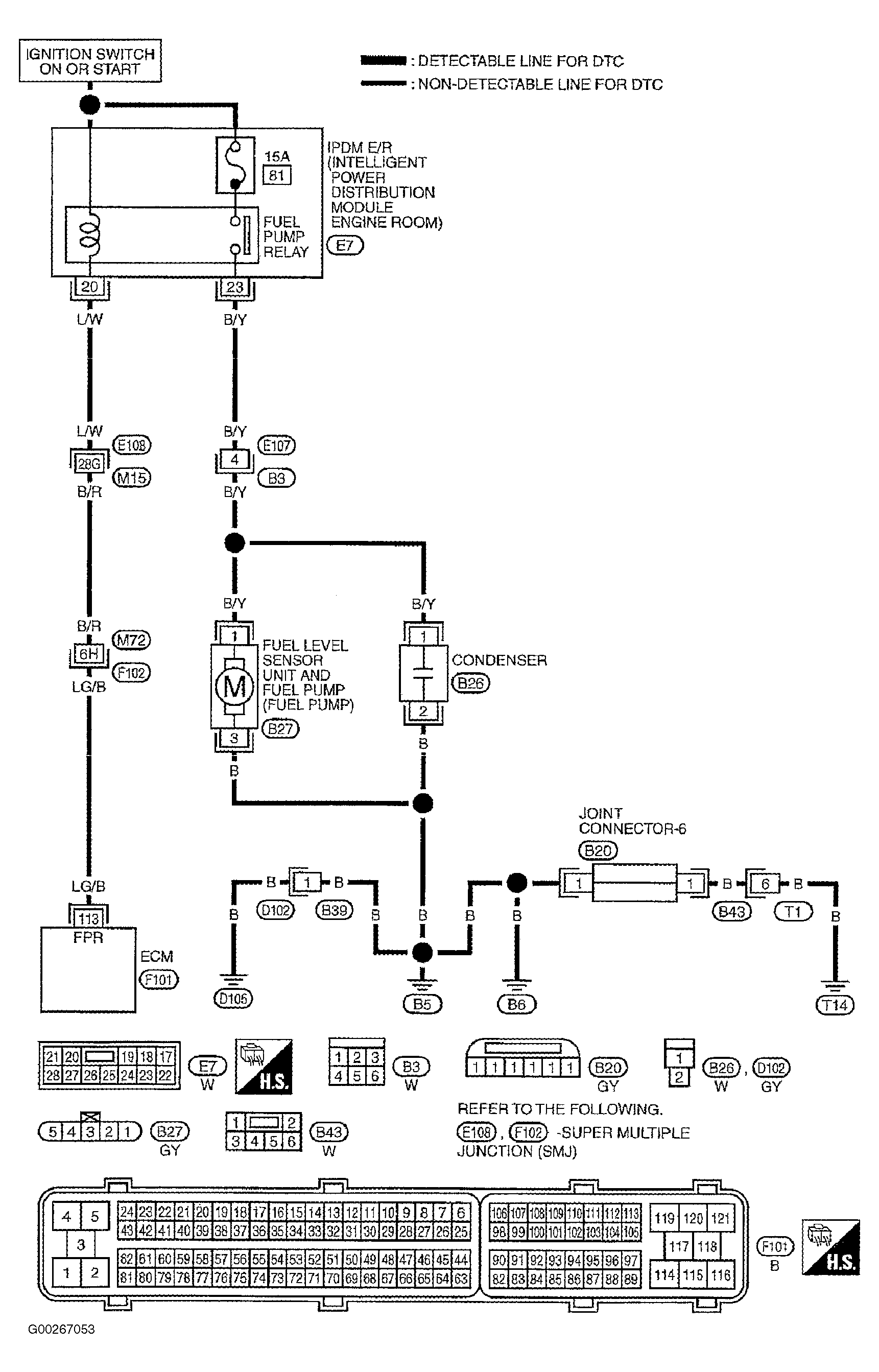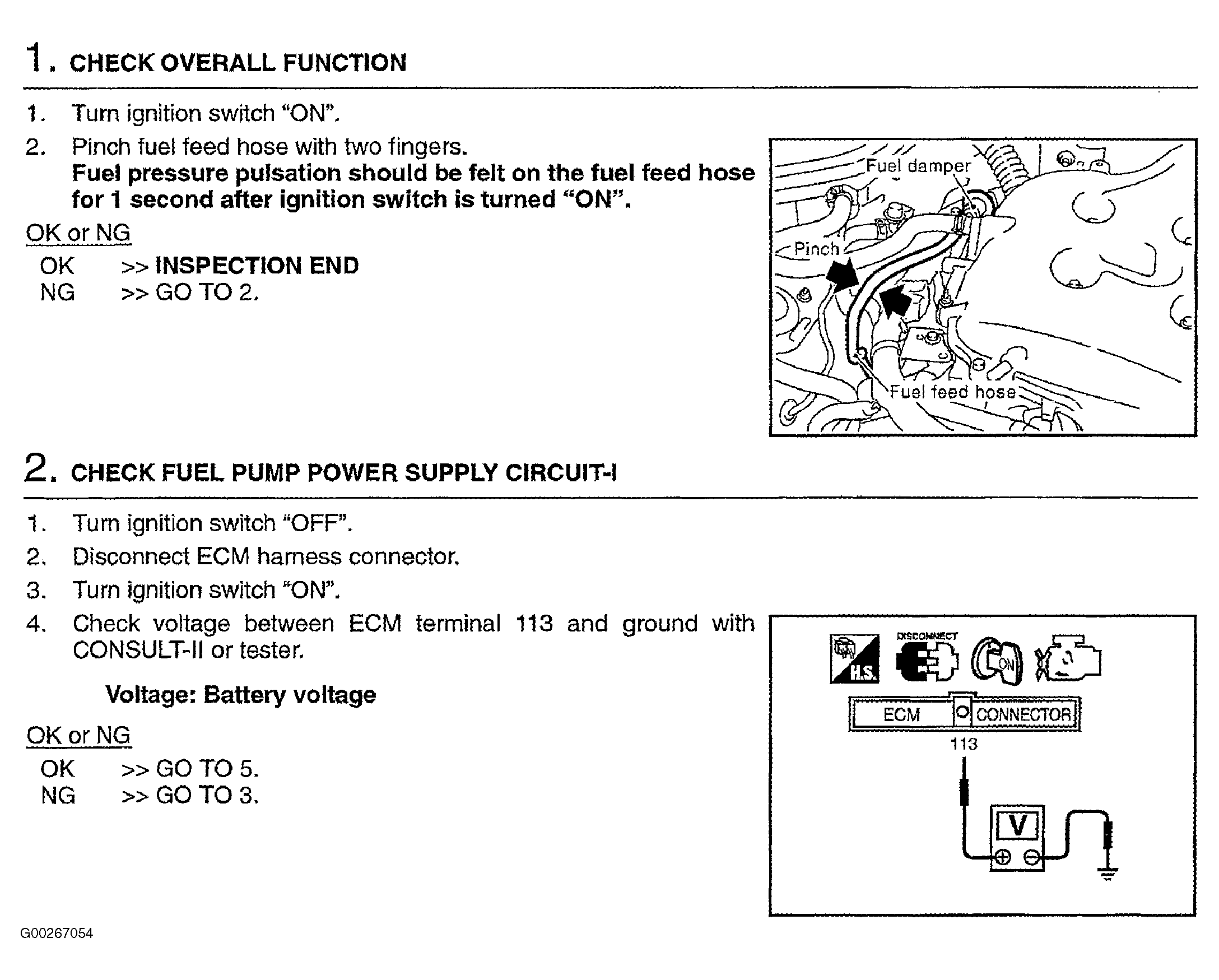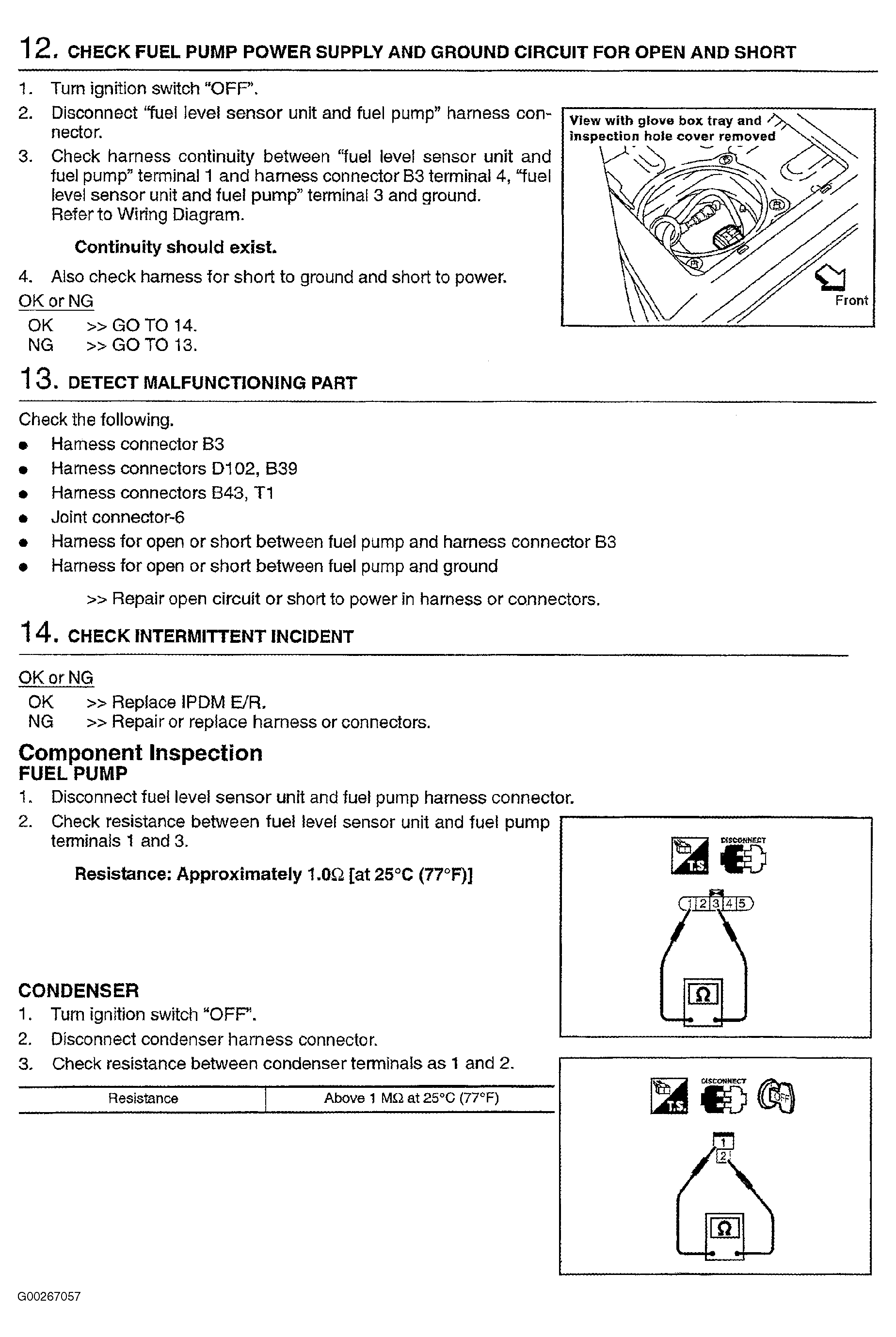 For fuel pump control system diagnosis and testing procedure, see Fig 2-Fig 5 . For fuel pump control circuit wiring diagram, see Fig 1. To check condenser, see FUEL SYSTEM CONDENSER . To check fuel pump, see FUEL PUMP . For relay location, see ECM & FUEL PUMP RELAY LOCATIONS table. If no problem is indicated at this time, problem may be intermittent. See INTERMITTENTS in TROUBLE SHOOTING - NO CODES article. For component removal and installation procedures, see appropriate REMOVAL & INSTALLATION article.