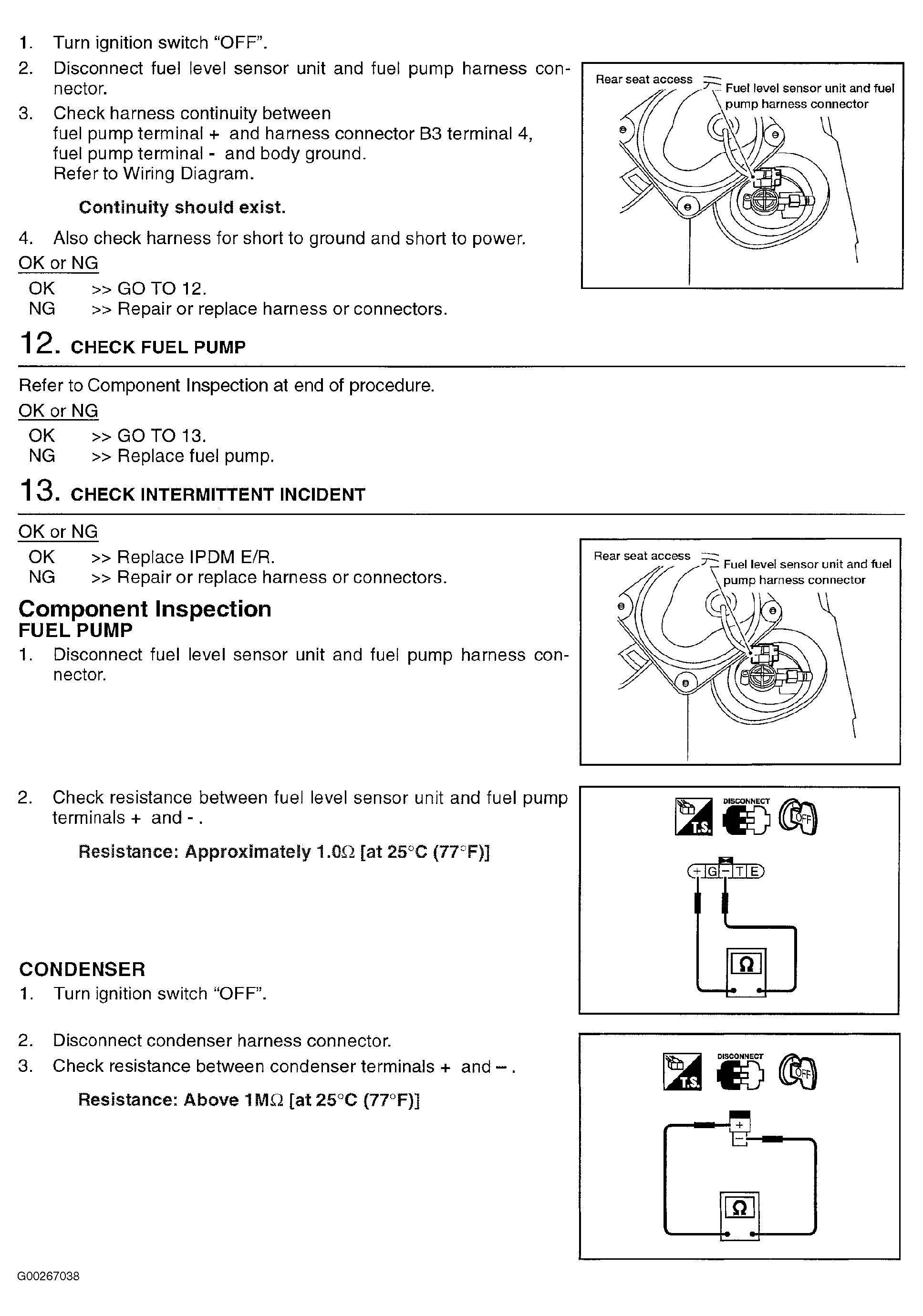 For fuel pump control system diagnosis and testing procedure, see Fig 2-Fig 5 . For fuel pump control circuit wiring diagram, see Fig 1. To check condenser, see FUEL SYSTEM CONDENSER . To check fuel pump, see FUEL PUMP . For relay location, see ECM & FUEL PUMP RELAY LOCATIONS  table. If no problem is indicated at this time, problem may be intermittent. See INTERMITTENTS in TROUBLE SHOOTING - NO CODES article. For component removal and installation procedures, see appropriate REMOVAL & INSTALLATION article.